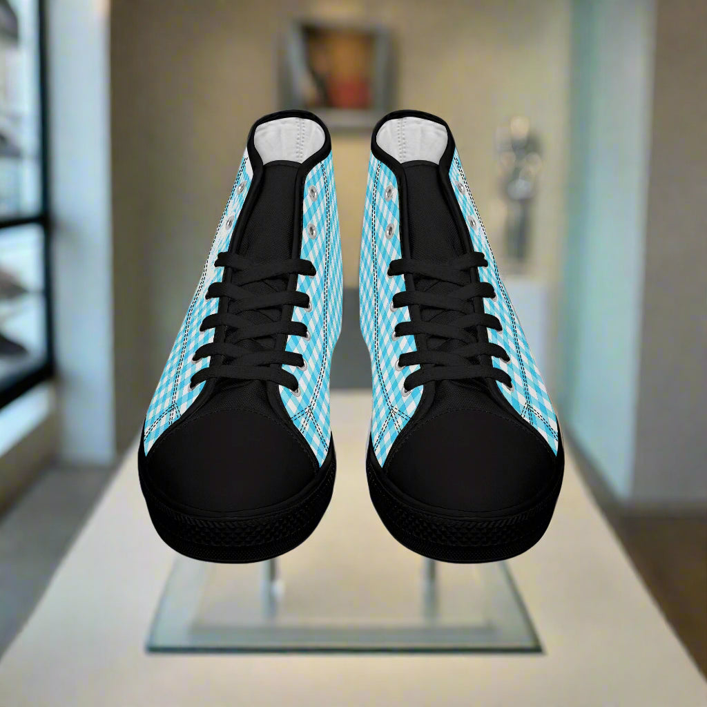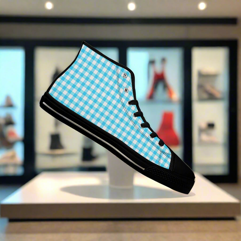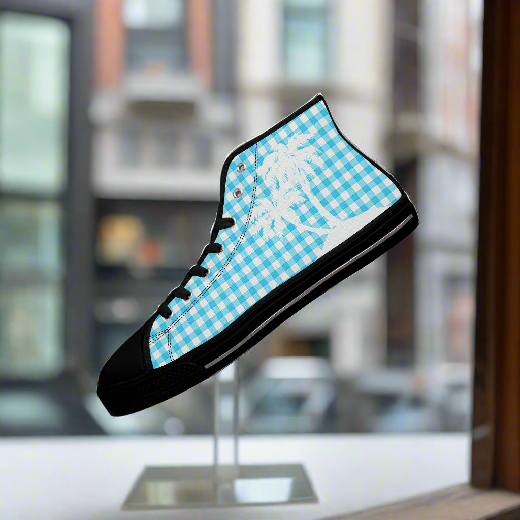 Looking for stylish summer kicks? Picnic Beach High-Tops bring cheerful warmth to any outfit. Lightweight and breathable, their picnic beach canvas material features a delightful blue checkered pattern that’s sure to brighten any outing.